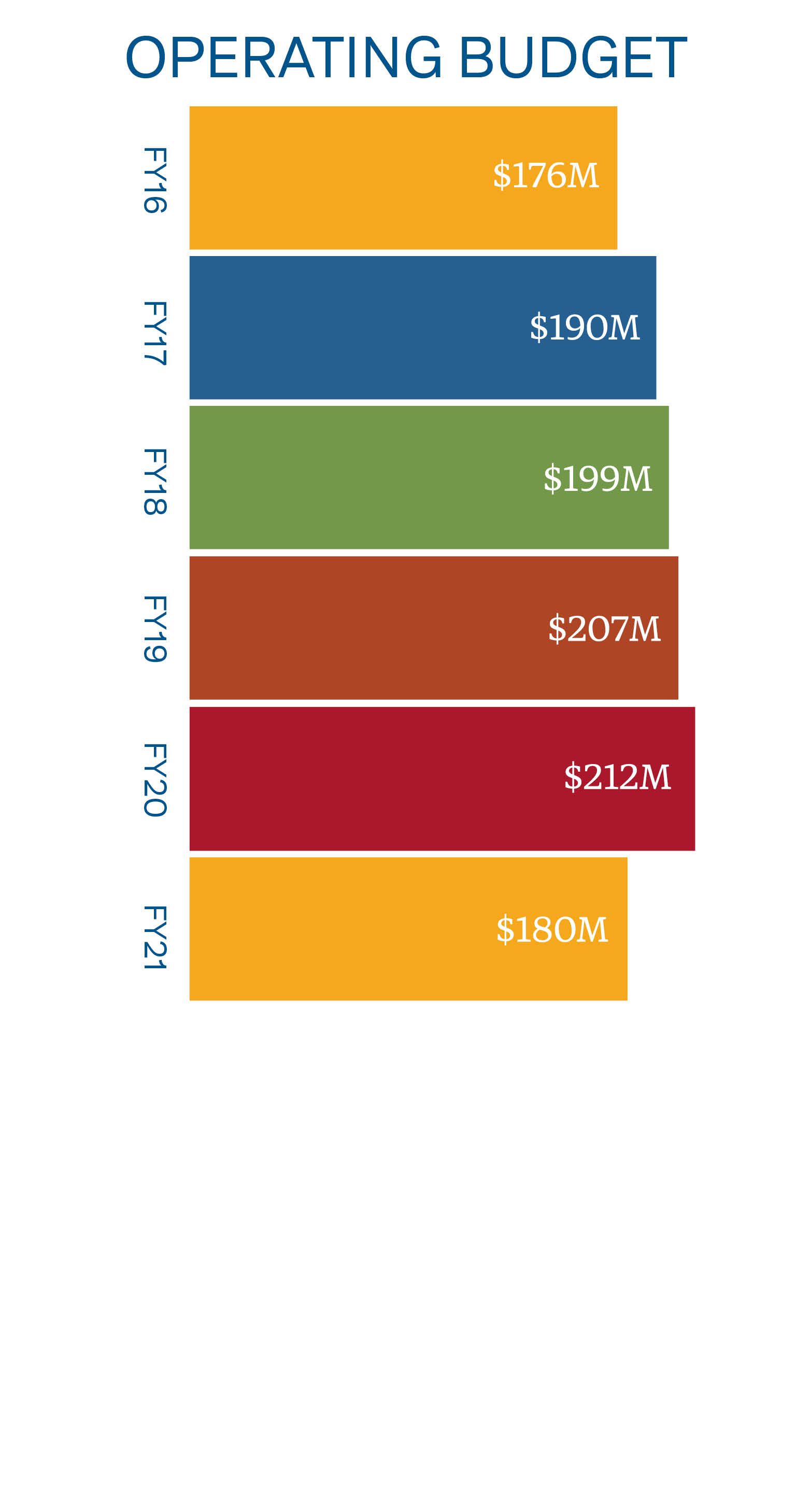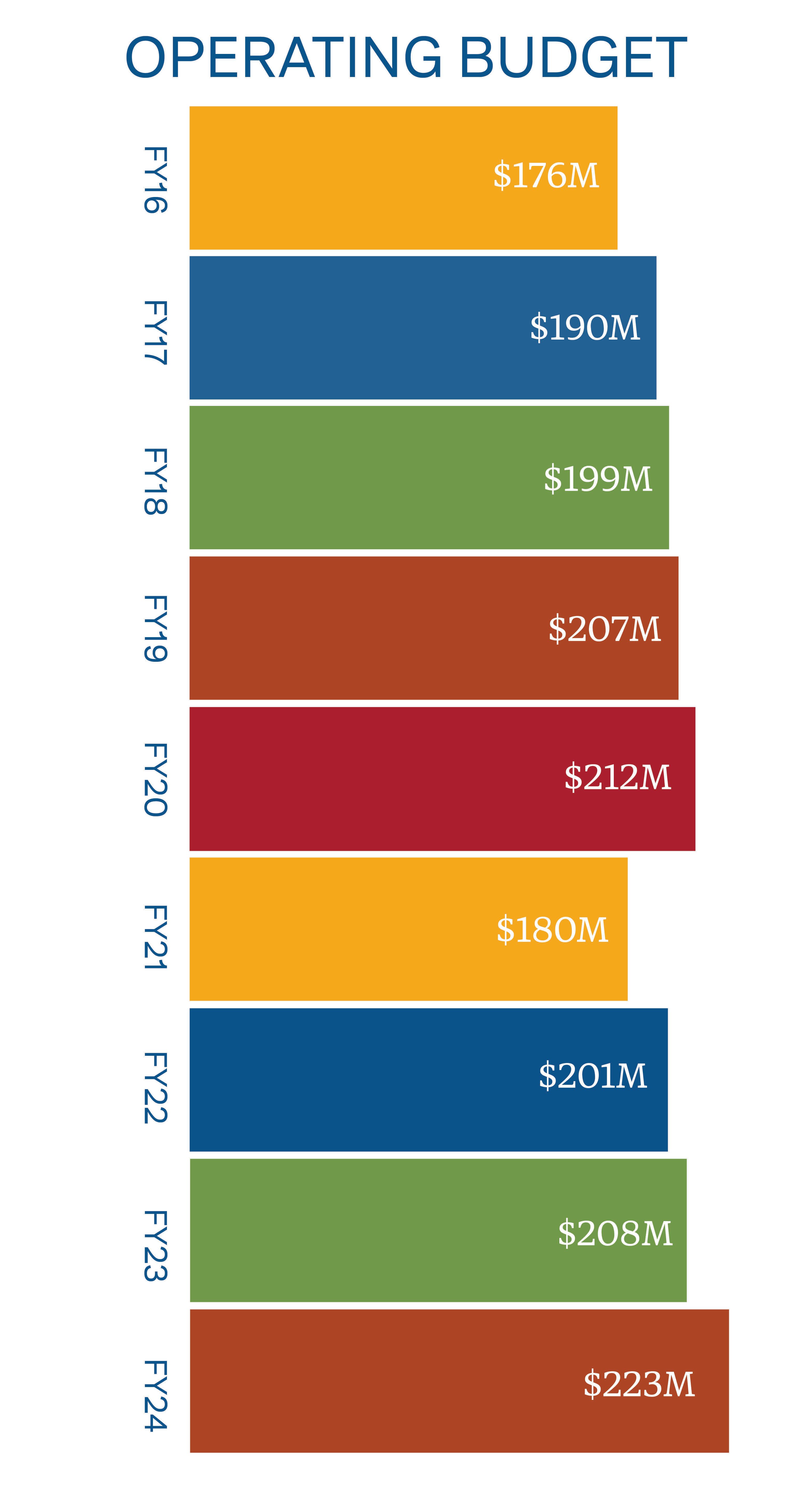 Bar graph showing general growth in operating reserves from fiscal year 2016 to fiscal year 2024. Bars alternate between the colors yellow, blue, green, orange and red.
